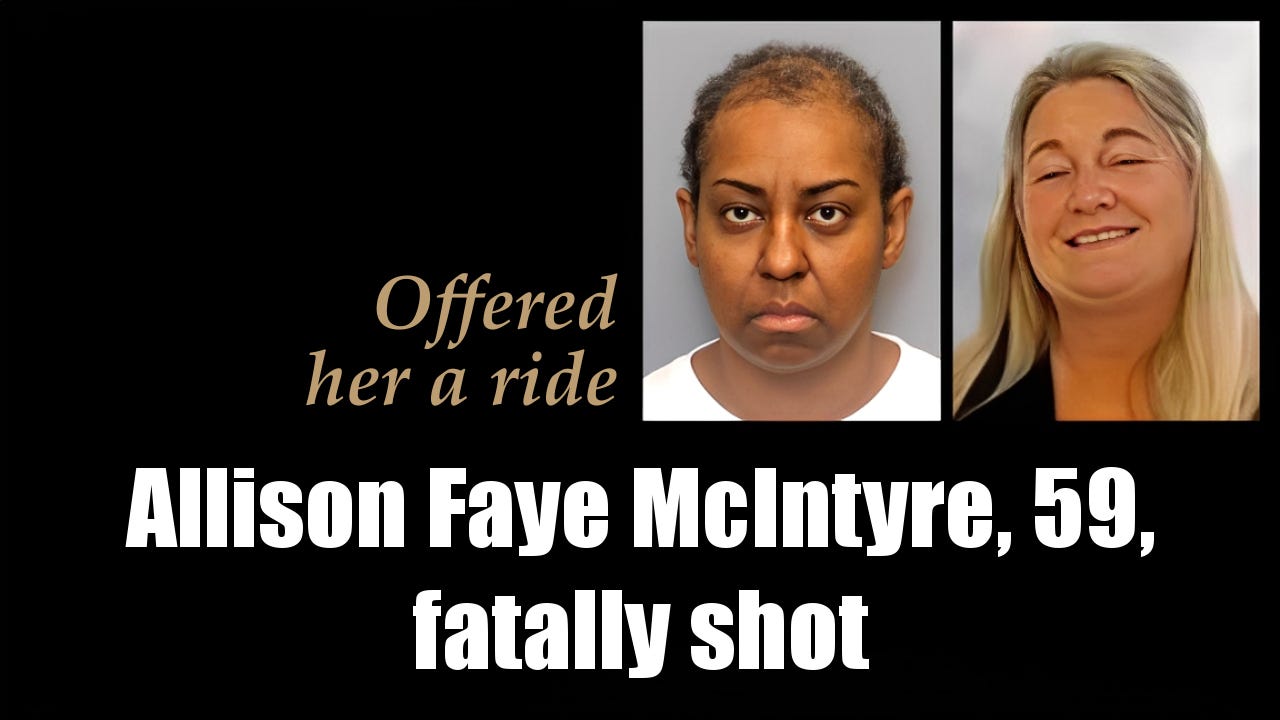 Reports say Allison Faye McIntyre, 59, was on the phone with her daughter when she was fatally shot in her car. McIntyre, a mental health counselor, was shot by her patient, Monet Thompson, 50, in the Safeway parking lot in Annapolis, Maryland, on October 3, 2024. McIntyre had offered Thompson a ride after her car broke down. Thompson faces first-degree murder charges in this killing and second-degree murder in the September 26, 2024, death of her boyfriend, John Thomas Logan III, 47. She remains detained. [Full report ►]