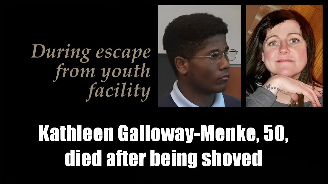 Kathleen Galloway-Menke, 50, died after being shoved by 15-year-old Jovahn Karhim Deon Mathis during his escape from a youth facility in Johnston, Iowa, on May 8, 2024. The Des Moines resident suffered a fatal head injury and passed away six days later. Now 16, Mathis pleaded guilty to voluntary manslaughter in May 2025, facing up to 20 years in prison at his July 2026 sentencing. [Full report ►]