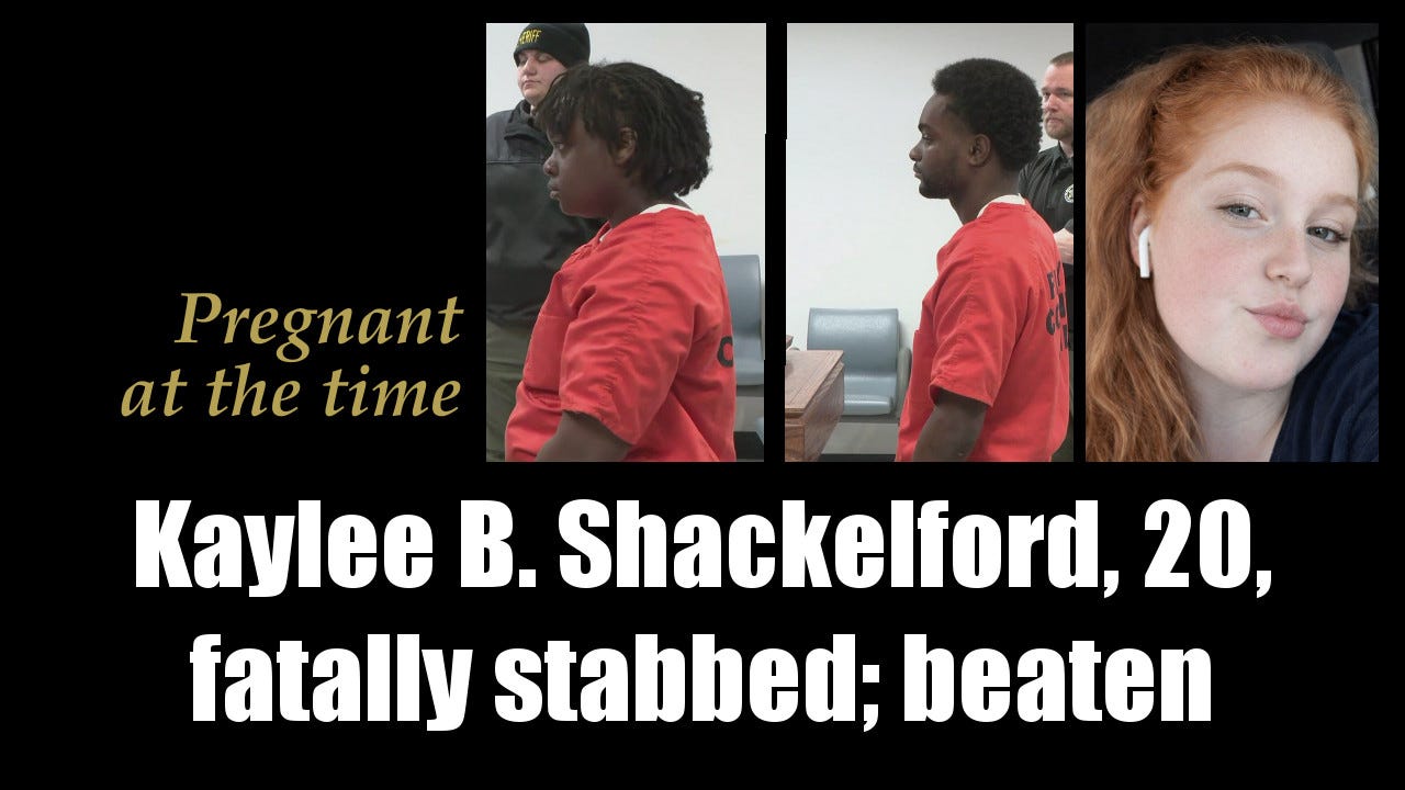 10. Kaylee B. Shackelford, 20, of Powell, Tennessee, was discovered deceased in Rome, Georgia, on December 9, 2025, after suffering multiple stab wounds and blunt force trauma. Pregnant at the time, she was allegedly attacked by acquaintance Mystique Malachi Amaziah Taylor, 23. Taylor and girlfriend Jayla McCullough, 19, hid her body. Taylor faces murder, assault, feticide, and evasion charges; McCullough is charged with concealing a death. [Full report ►]