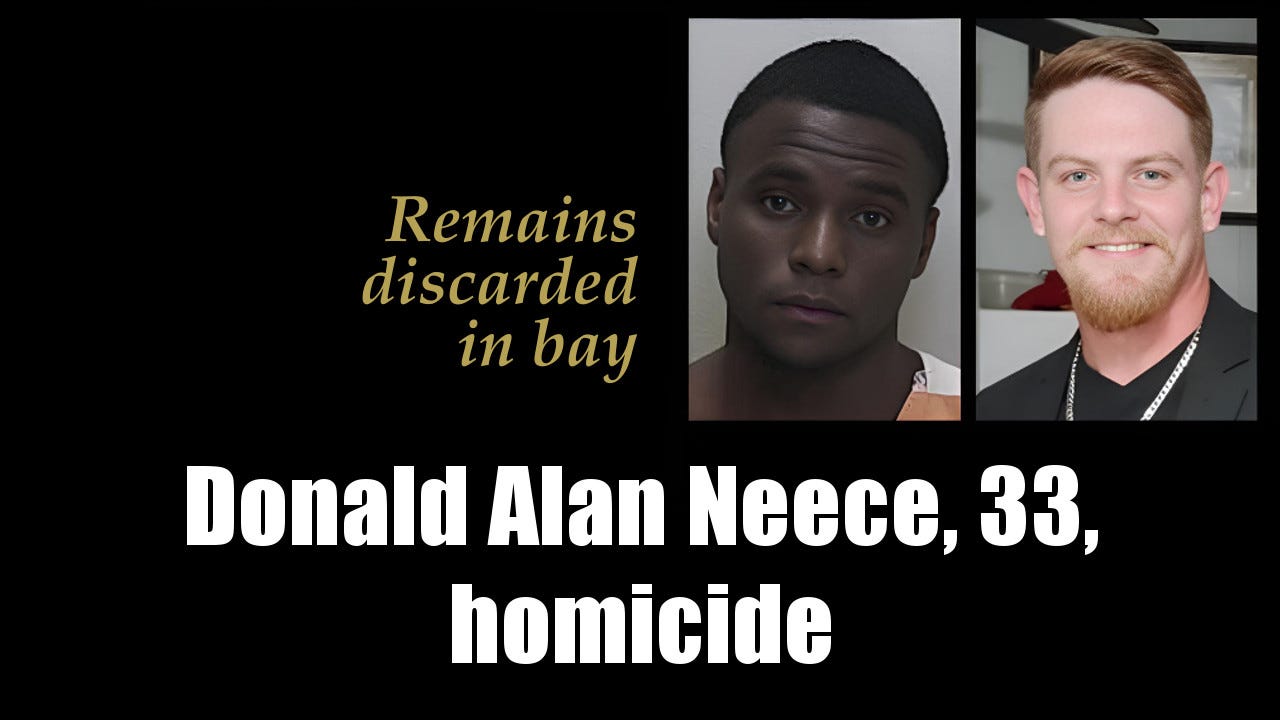 Donald Alan Neece, 33, was found dead in Mobile Bay, Alabama, on January 29, 2026, in an apparent homicide. Authorities say the Mobile native's body, recovered near the Interstate 10 bridge, showed signs of foul play from an encounter the previous day in Daphne. Suspect Zachri Frazer, 22, a Jamaican national, was arrested February 3, 2025, in Florida on murder charges after fleeing in Neece's vehicle. [Full report ►]