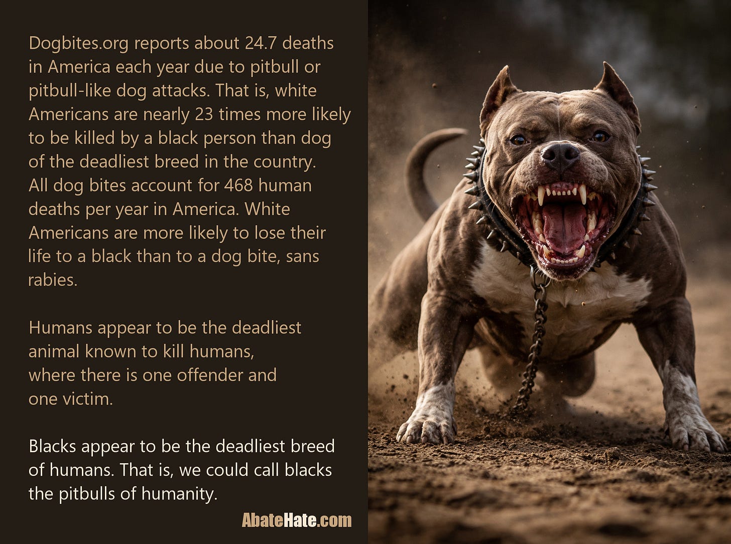 For comparison, dogbites.org reports about 24.7 deaths in America each year due to pitbull or pitbull-like dog attacks. That is, white Americans are nearly 23 times more likely to be killed by a black person than dog of the deadliest breed in the country. All dog bites account for 468 human deaths per year in America. White Americans are more likely to lose their life to a black than to a dog bite. Statistics do not include rabies.