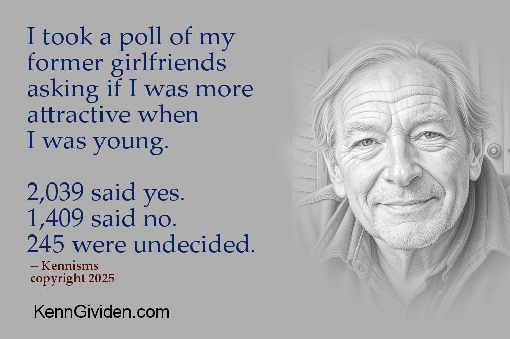 I took a poll of my former girlfriends asking if I was more attractive when I was young. 2,039 said yes. 1,409 said no. 245 were undecided.