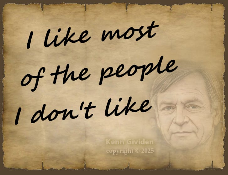 I like most of the people I don’t like. Or, “Just because I don’t like someone doesn’t mean I don’t like them.” Some people are likable but untrustworthy, offensive, or exhibit undesirable traits. I may even enjoy their company, though some aspects of their character give me pause.