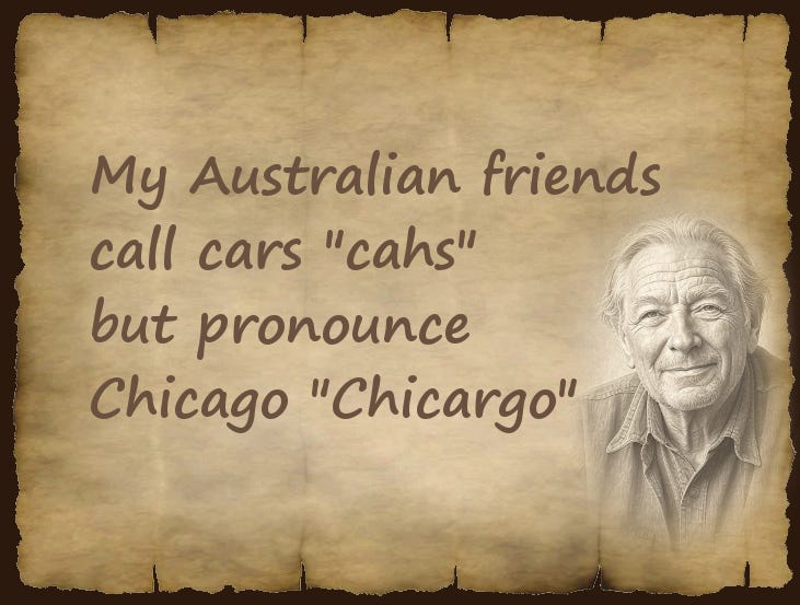 My Australian friends call cars “cahs,” but pronounce Chicago “Chicargo.”